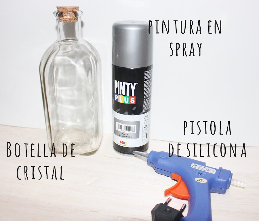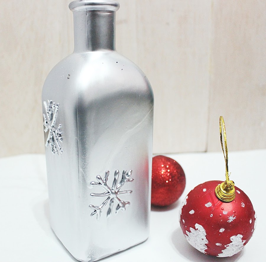 Limpiamos bien la botella de cristal y pintamos estrellas de nieve con la pistola de silicona. Tened cuidado con los hilitos que se quedan de la silicona y cuando estén secos quitadlos bien.