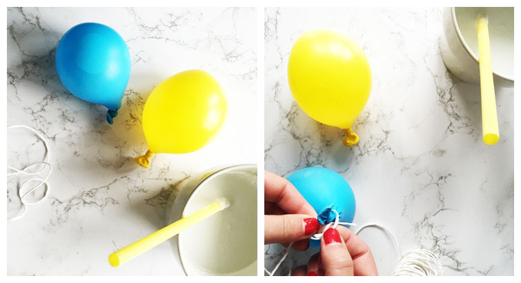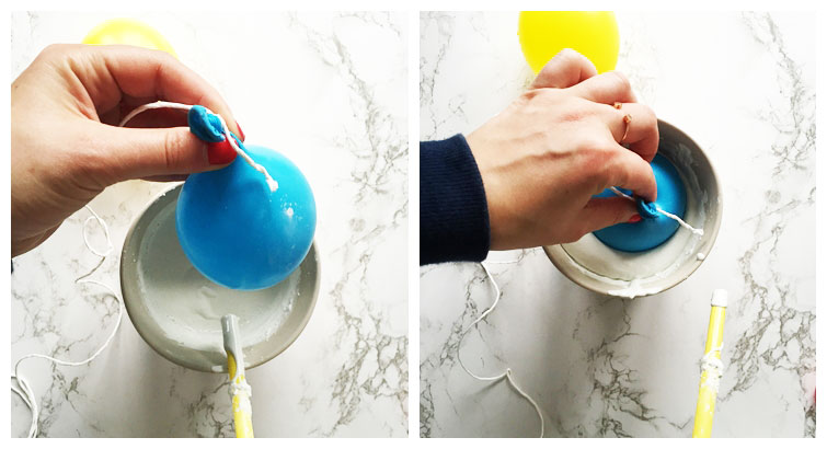 ATAMOS UN TROZO DE CORDÓN SOBRE EL NUDO DEL GLOBO Y LO INTRODUCIMOS EN EL CEMENTO BLANCO.