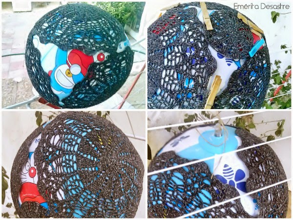 Un vez montada la lámpara se deja secar hasta que endurezca bien, 48 horas, yo la colgué en un tendedero con una cuerda por donde se infla la pelota. Os recuerdo para quienes no lo sepan que la cola una vez que está seca es transparente y que queda muy dura.