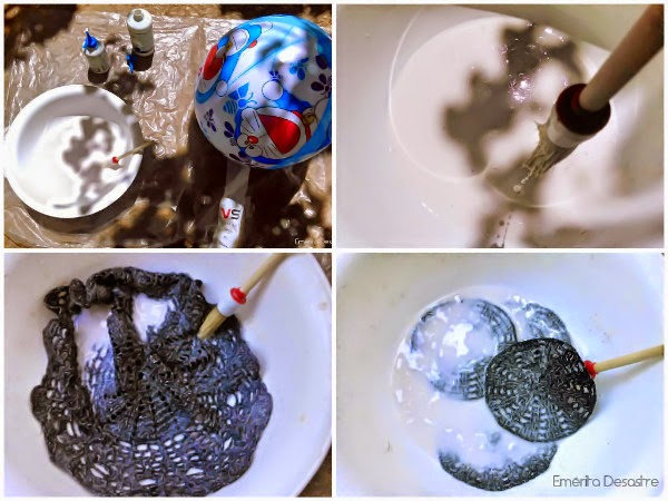 Se empieza poniendo uno grande justo en la parte opuesta del inflador de la pelota para después pasar por el agujerito central del mantelito, el cable del portalámparas. Lo dejé secar un rato y luego puse los otros.