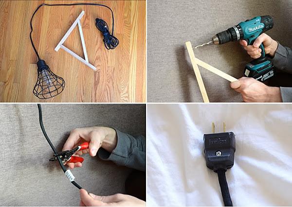 Lo primero y fundamental que tendremos que hacer es hacer los agujeros con ayuda de un taladro y una broca de madera en la escuadra para poder pasar el cable. La segunda cosa es si no encuentras un cable para pared (sino que es de techo) o te ha gustado una lámpara de techo como de este tipo con rejilla u otro modelo, no te preocupes porque solo tienes que adaptar el cable con un enchufe y un interruptor, para esto solo necesitaras unos alicates, cortar y empalmar.
