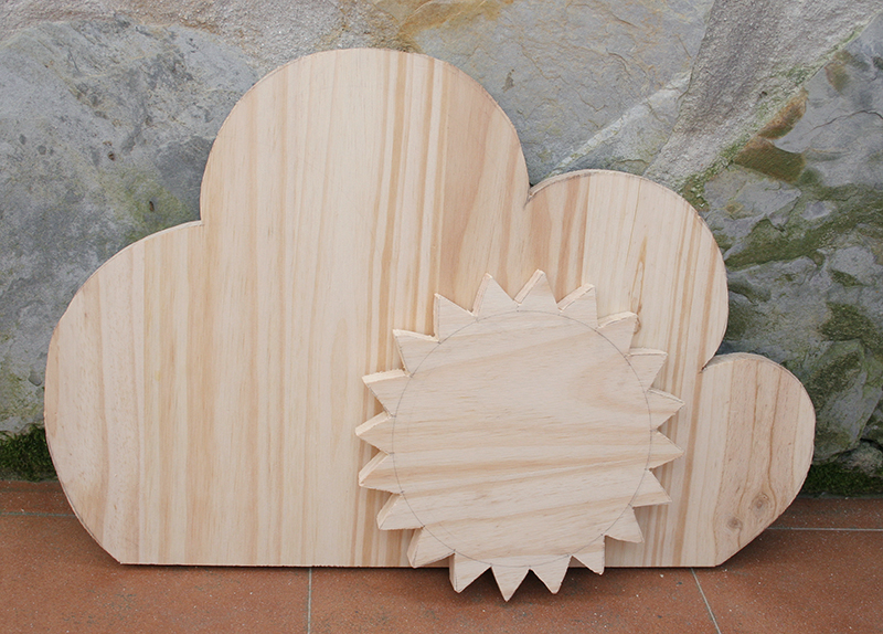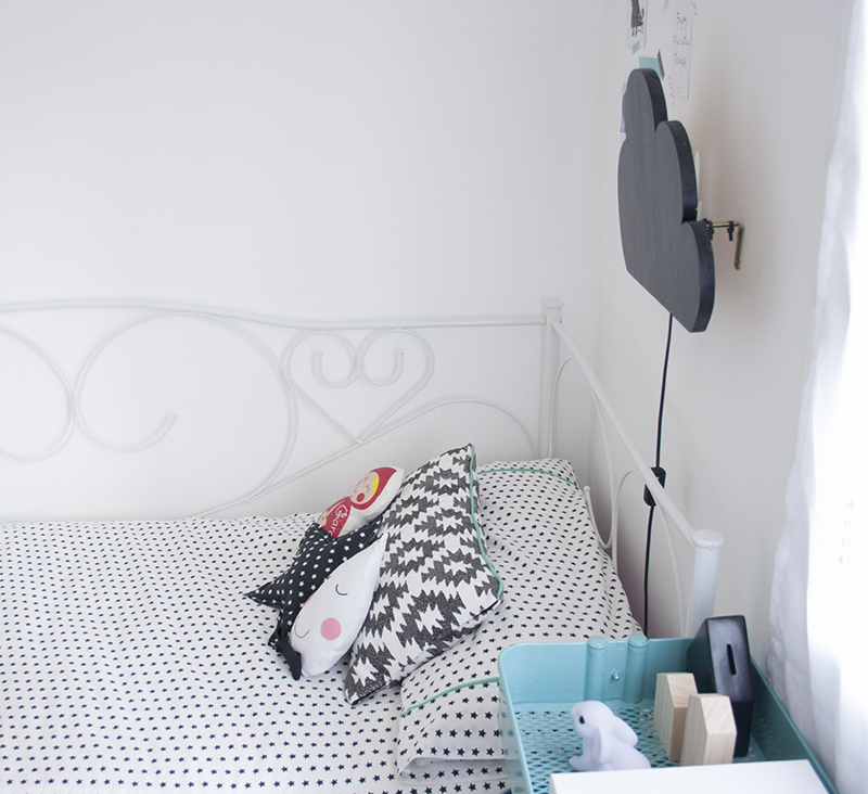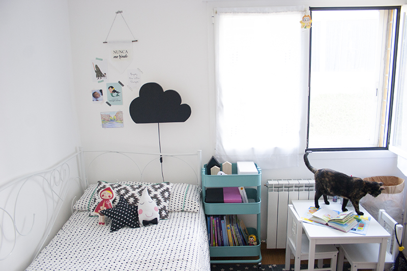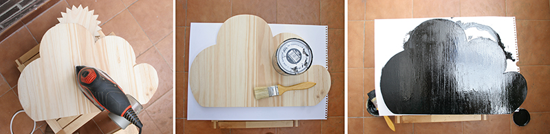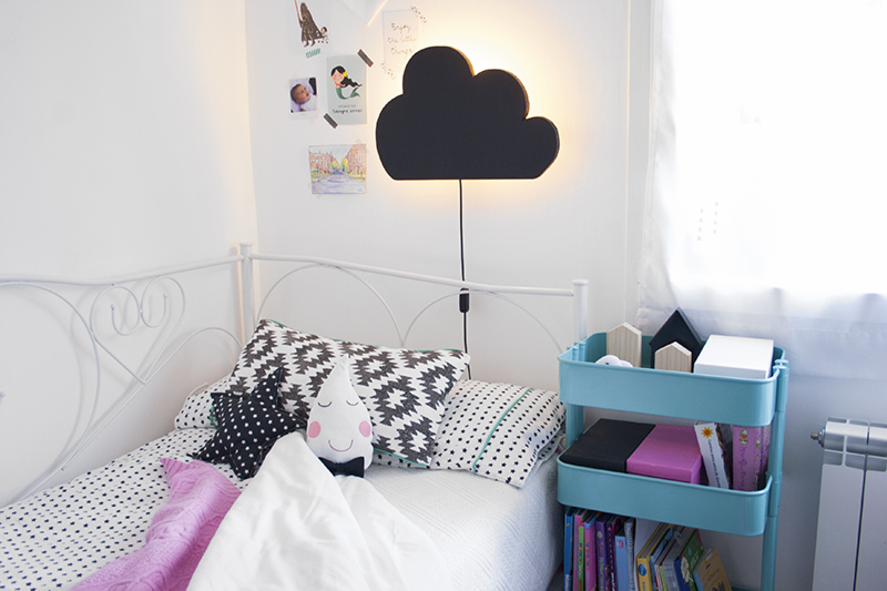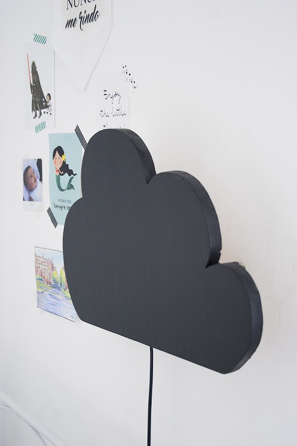 Un diy lowcost en el que participamos todos: Yo hice el dibujo de la nube a mano alzada, mi otra mitad lo cortó con la caladora y organizó los cables para que funcionara bien, y los peques la lijaron y la pintaron ;)