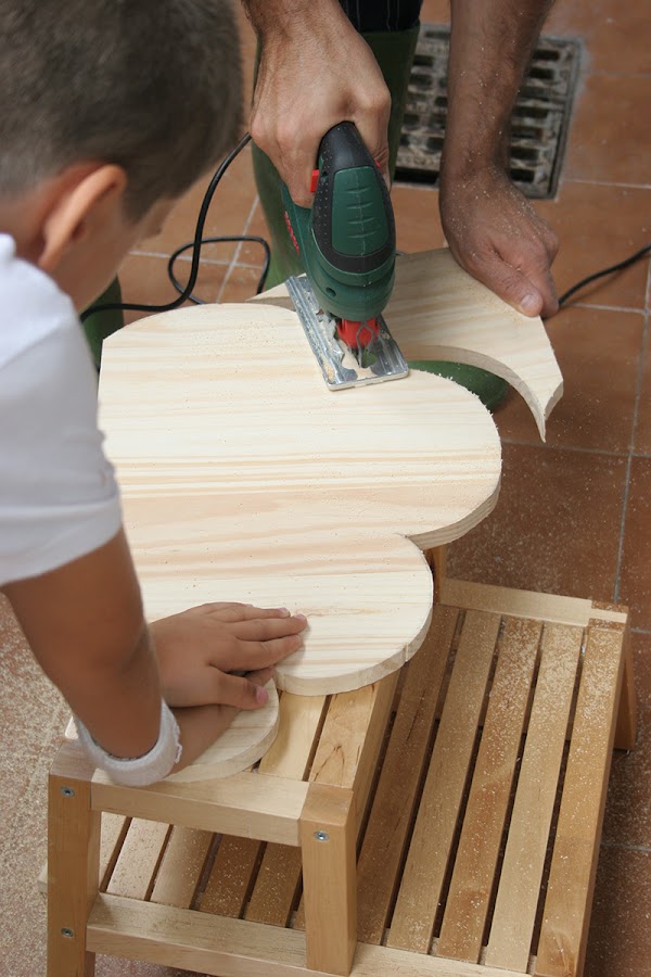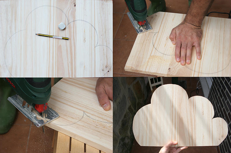El primer paso es bien sencillo, se trata de dibujar la nube y recortarla con la caladora. Esta vez, se encargaron los chicos de ello ;)