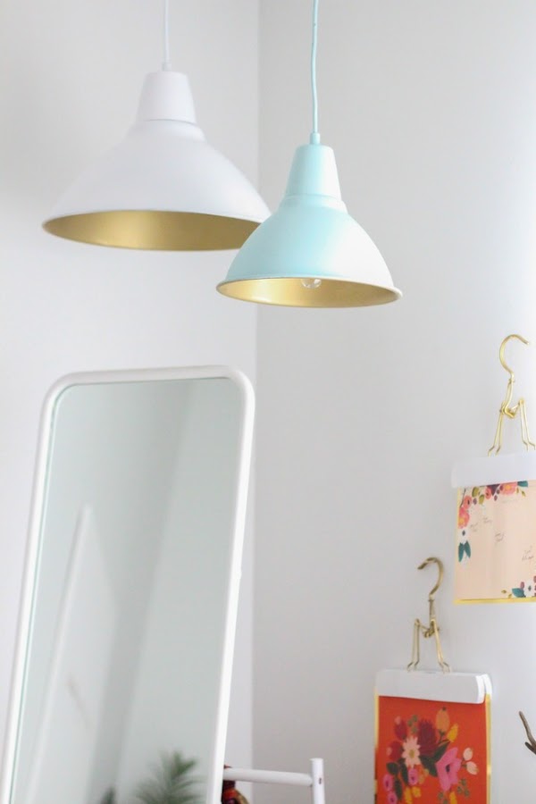 Se trata de la lámpara Foto de Ikea que cuesta solo 7,99? pintada con spray dorado por la parte de dentro, y si los colores que hay (rojo, verde y beige) no son los colores que estás buscando, es tan fácil como pintarlas con spray del color deseado por la parte de fuera.
