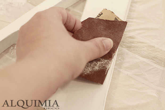 Una vez seca (yo la dejé de un día para el otro) ya podemos lijarla, yo en este caso le quería dar un aspecto desgastado. En un principio solo lijé los bordes, pero tal y como avanzaba me iba picando el gusanillo de desgastarla más, así que la empecé a lijar con más fuerza.
