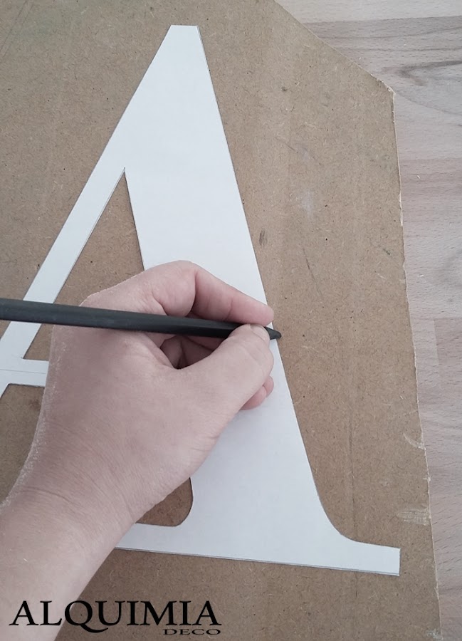Lo primero que hay que hacer es imprimir y recortar nuestra plantilla con mucho cuidado para que nos queden las lineas lo más rectas posibles. Una vez la tengamos recortada, pasaremos a copiarla encima de nuestro trozo de madera. Hay que tener cuidado de que no se nos mueva la plantilla, sino nuestra letra quedará mal calcada.