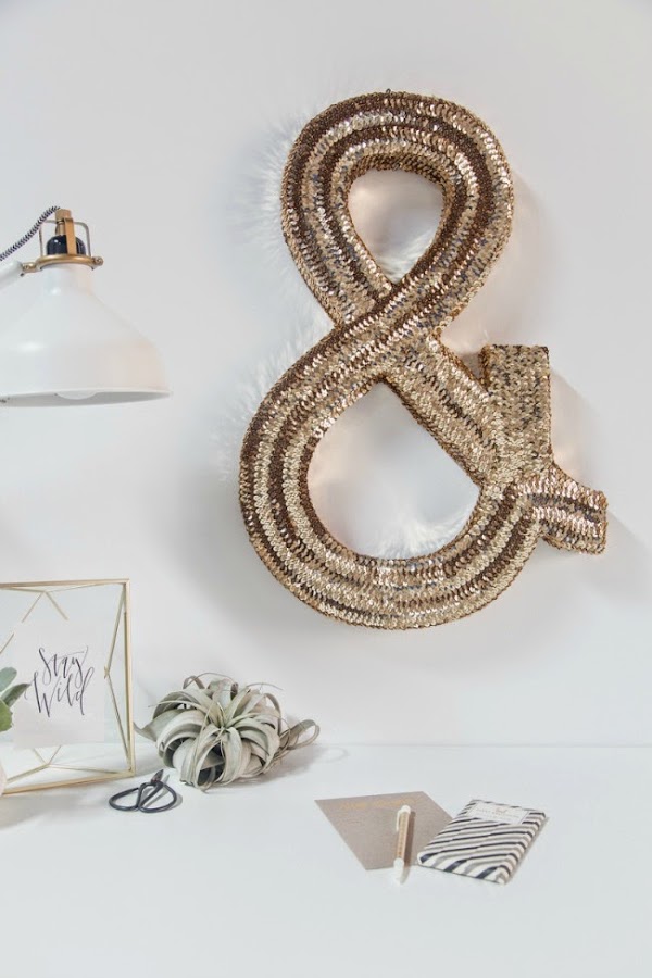 En este caso como era una habitación compartida elegimos esta letra para hacer el juego entre ambas camas, pero podemos elegir la inicial de nuestro hijo/a y el proceso es muy sencillo. Compramos una letra en papel maché, puedes encontar algunas en PoppinsHouse, CentroArtesano o en La Fiesta de Olivia, aunque en cualquier centro de manualidades las tienen. Luego compramos cinta de lentejuelas en alguna mercería o en la web podemos encontarlas en Reinavic o en Merceria Sires, pueden ser en dorado o en otro color que combine con el resto de accesorios de la habitación y empezamos a pegar de derecha a izquierda y la siguiente hilera la pegaremos al revés de izquierda a derecha para que haga el efecto rayado que vemos en las fotos: