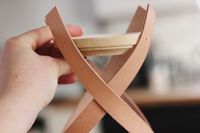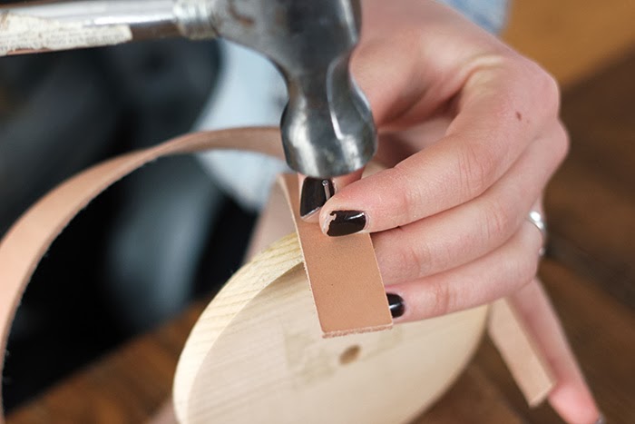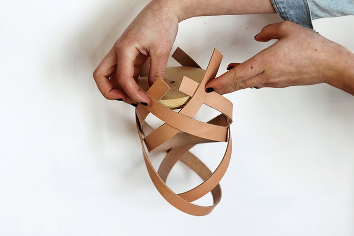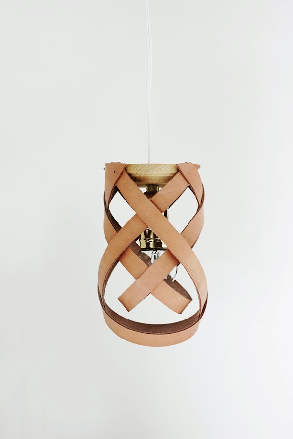 Necesitas una pieza circular de madera, tiras de cuero, casquillo, bombilla, cable, taladro, tijera y clavos.
