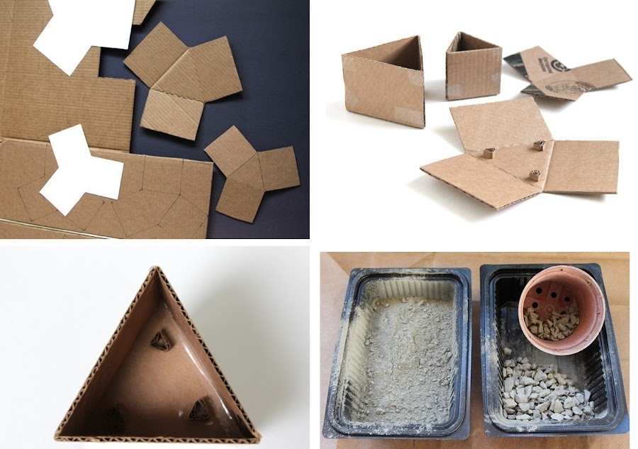 Recortas las piezas en el cartón y añade (si quieres) como se ve en la foto, tres rollitos de cartón pegados en la base de la pieza exterior (que servirán para que tu maceta disponga de drenaje). Dobla y sella las ranuras del molde con la cinta adhesiva.