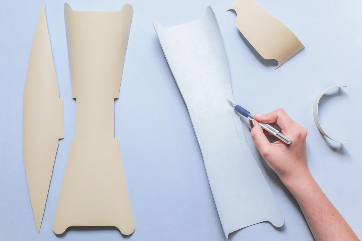 2. Corta las piezas según tu patrón. Haz dos agujeros en el lugar correspondiente cada lateral, para colocar los ojales simplemente tendrás que superponer dos piezas. La autora del blog nos recomienda cortar las piezas con un cuter/bisturí ya que es mucho más preciso pero esto dependerá de las habilidades y la práctica que tenga cada uno.