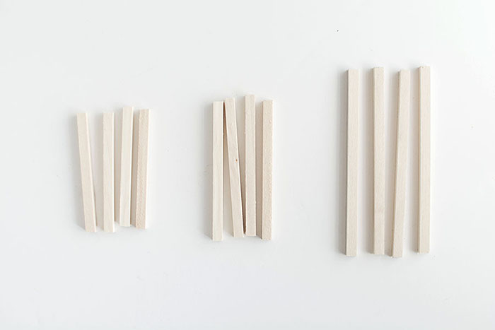 Para empezar el trabajo cortaremos los listones en tres tamaños. ¿Por qué tres? Muy sencillo, vamos a hacer dos mini maceteros por lo tanto al tener alturas distintas necesitan medidas diferentes. Teniendo en cuenta que el tercer tamaño del listón corresponde al diámetro de ambos maceteros, que en este caso será el mismo.