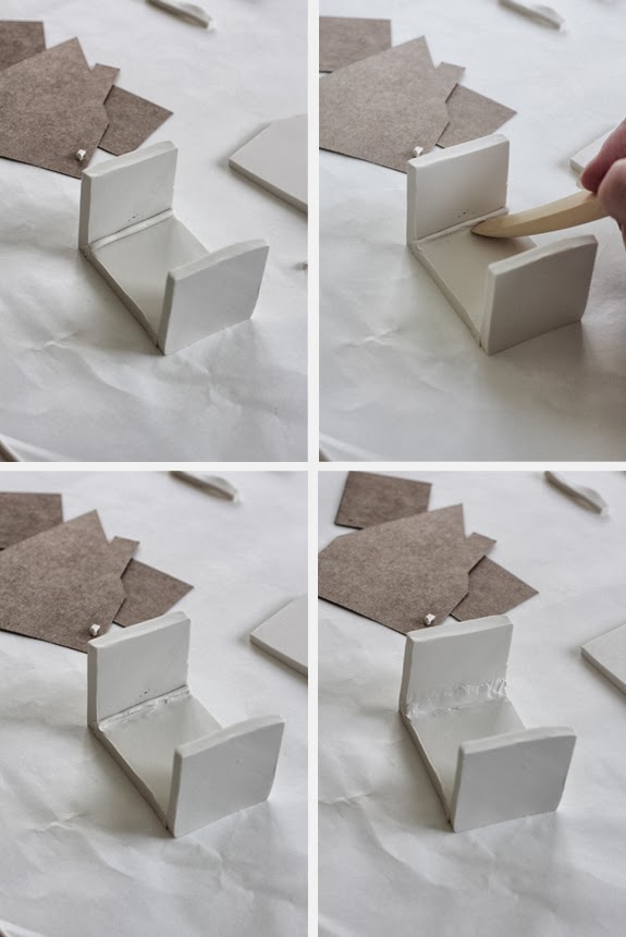 Una vez que tengas todas las piezas cortadas, toma la pieza base y presiona las dos piezas laterales en los extremos. Queremos hacer el bote hermético, por lo que tomar un pequeño pedazo de arcilla extra y hacer un rodillo en forma de serpiente bastante delgada. Coloque la "serpiente" en el interior join (donde el lateral se encuentra con la base). Con la herramienta, que forma parte de squash suavizado de la "serpiente" en la base y alisarla. Luego hacer lo mismo con la parte superior de la "serpiente". He tratado de demostrar en las fotos de arriba. Haga lo mismo para ambas partes.