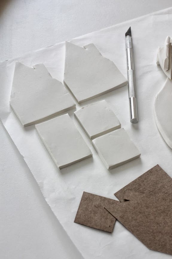 Si vas va a utilizar una plantilla, descárgalo aquí , imprimela sobre un cartón y corta alrededor de él. Coloca las piezas en la arcilla y utilizar el cuchillo para cortar cuidadosamente alrededor de las formas.