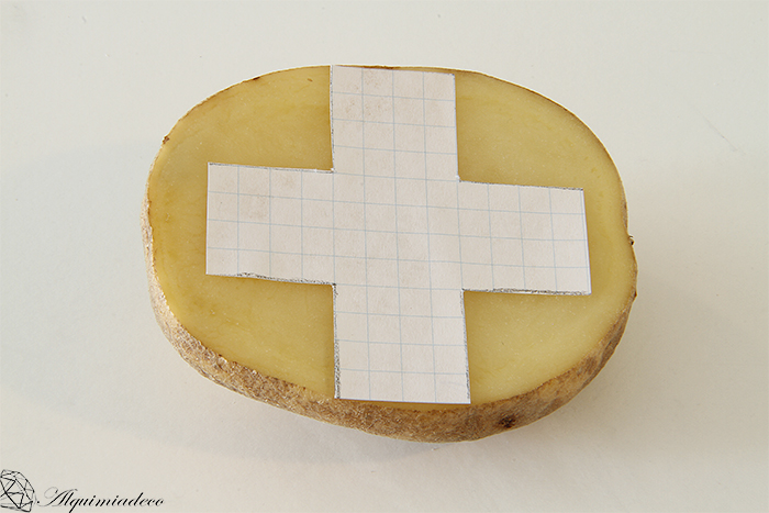 Lo primero que tenemos que hacer es recortar nuestra plantilla en forma de cruz y colocarla encima de la patata. Hay que tener en cuenta que la patata tiene que ser suficientemente ancha para que quepa nuestra cruz. La mía mide 6cm de ancho x 6cm de alto.