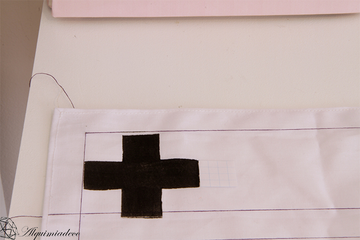 Como me daba miedo marcar la tela con el lápiz, yo he hecho las líneas con aguja e hilo, pero si a vosotros os da igual, podéis marcarla con un lápiz sin apretar.