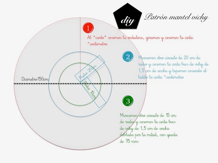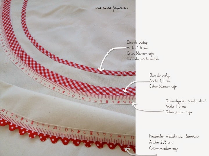 - necesitas 1,5 mts tela loneta de algodón. Corta un círculo con ese diámetro, después dibuja círculos concéntricos más pequeños como explico en el patrón y cose encima las cintas y bieses.
