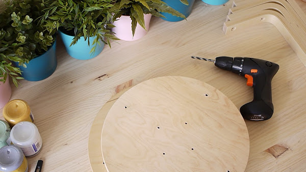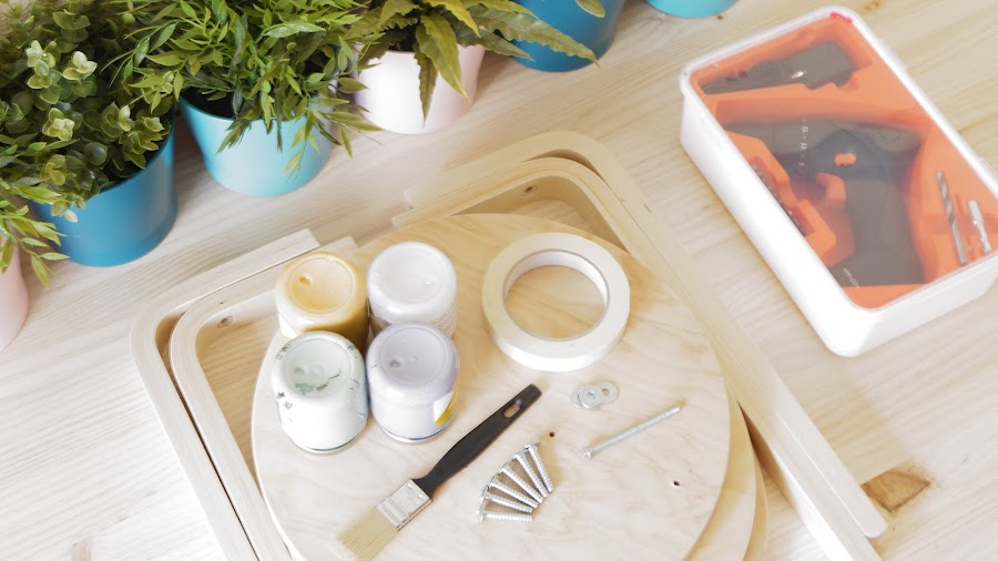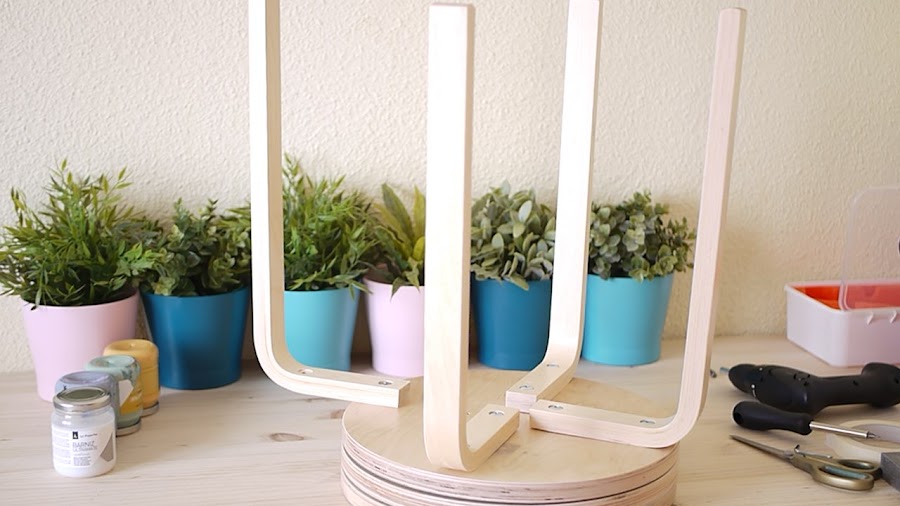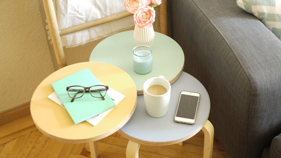 Como os comentaba, yo transformé el taburete en esta mesita abatible multiposición tan colorida. Para ello solo necesitas 3 tabueretes Frosta, 1 tornillo de 9cm, taladro, y tu kit de pintura.