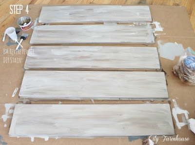 Una vez secos, tendremos que unirlos a la mesa, yo los uniría solo con cola de madera, para que en los laterales no se vean los clavos, como lo ha hecho la propietaria de esta mesa (Os dejo el enlace por si quereis ver los colores exactos que han utilizado aquí)