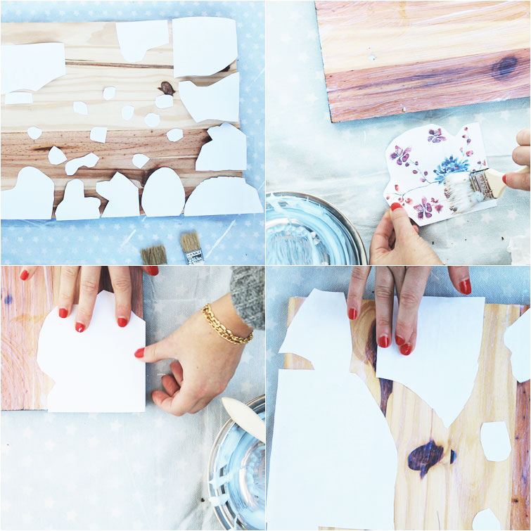 Ya tenemos sobre el tablero los dibujos recortados, boca abajo y en el lugar que queremos fijarlos. Ahora toca coger brocha y aplicarles el transfer por la cara impresa.