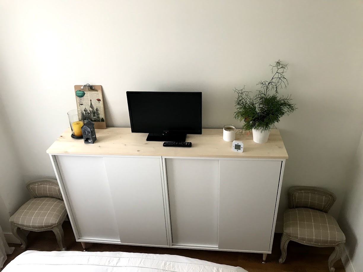 Hace tiempo os enseñé nuestro dormitorio. A los pies de la cama instalamos un zapatero: Un mueble con poco fondo, que nos solucionaba parte de nuestro problema de espacio y sobre el que además podíamos instalar la TV del dormitorio.