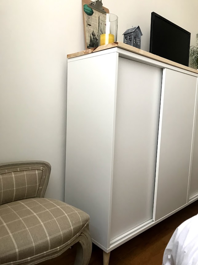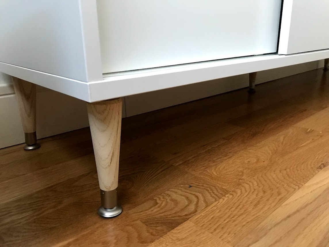 Nuestra alegría fue encontrar el zapatero Mackapär con un fondo perfecto y puertas correderas. El resto ha sido coser y cantar: Un tablero de abeto que compramos y cortamos en Leroy Merlín, estas preciosas patas de estilo mid century de amazon y los tiradores de metal y piel beige (que aún no nos hemos decidido a instalar) de Zara home.