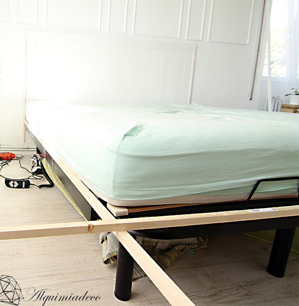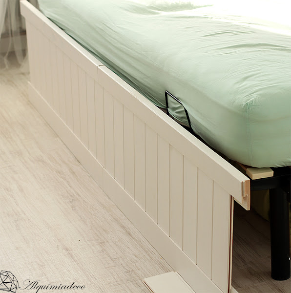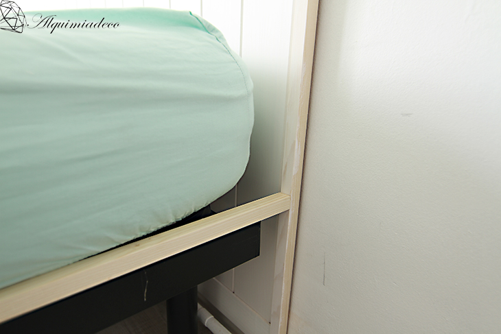 Una vez hecho esto, fijamos el friso a nuestra estructura de la cama. Como véis en la fotografía superior, nosotros dejamos el trocito justo para que el listón encajara y así quedara mucho más fuerte.