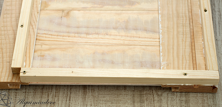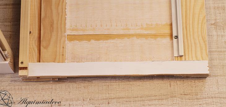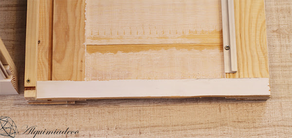 Después empezamos con la parte que iba a ser la que podríamos sacar. Así que esta vez volvimos a cortar nuestro friso a 30cm y montarlo encima de los "railes" que traía nuestro friso. Después volvimos a hacerle un marco con listones pero esta vez solo unimos la parte inferior con un listón, y los laterales con un trozo de friso, ya que necesitábamos que fuese un poco más delgadito. En la parte superior de la puerta, le pusimos un canto de aluminio con forma de L que sería nuestra fijación para la puerta y la otra L fijada a la estructura de la cama.