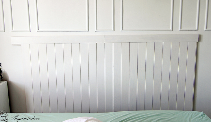 El cabezal fue lo más fácil. Nosotros lo unimos a la pared esta vez, como si fuese friso!. Así que fijamos la parte inferior, después la superior y fuimos introduciendo lamas hasta que tuvimos todo el ancho de la cama hecho. Después añadimos unos listones en cada lateral y los pintamos de blanco para que quedara mas disimulado.