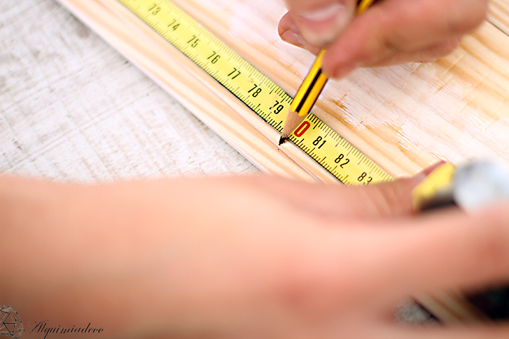 Lo primero que tenemos que hacer es medir la altura que queremos nuestra cama, en mi caso era de 40cm, así que medí y me dio que tenía que cortar las lamas de friso a 30cm porque entre la parte superior y la inferior ya me sumaban los 40cm que yo quería. Corté todas las lamas que me hacían falta, que fueron unos 23 trozos aproximadamente (esto dependerá del ancho de vuestra cama) y las uní tal y como os enseño en las fotos.