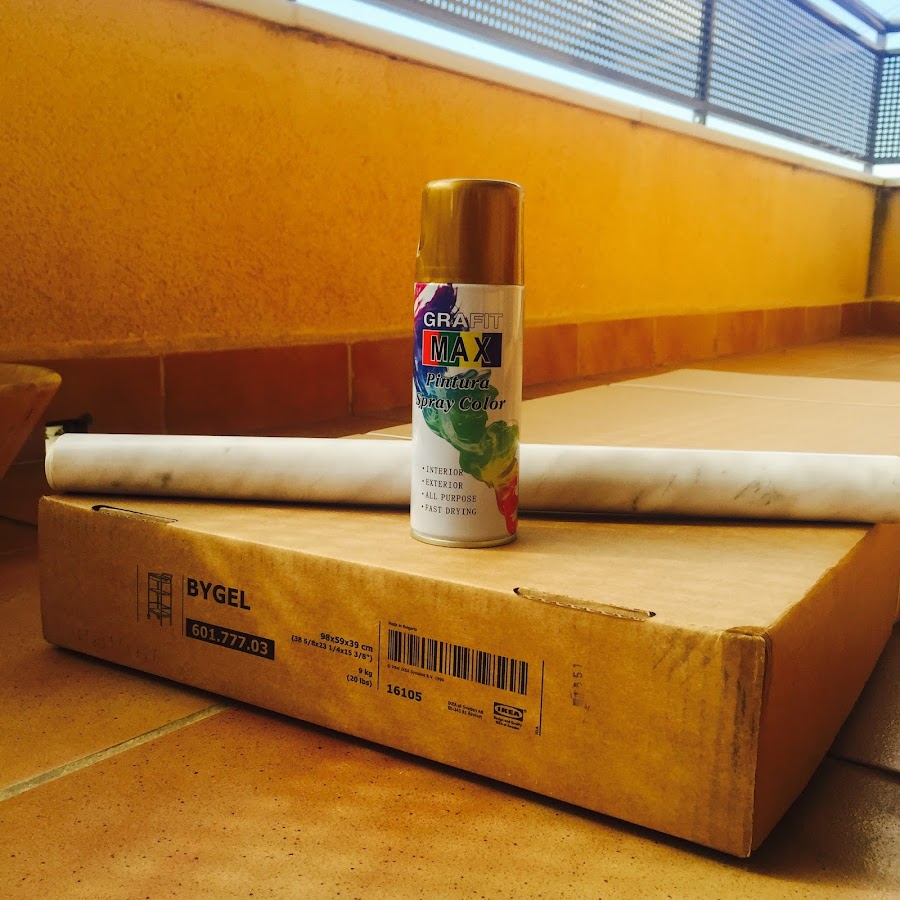 También necesitamos un par de sprays de pintura dorada (yo los compro en un bazar chino a 2€ cada uno) y un rollo de vinilo adhesivo que simule mármol (yo lo encontré en un almacén de venta al mayor para tiendas de todo a 1€ a eso, a 1€).