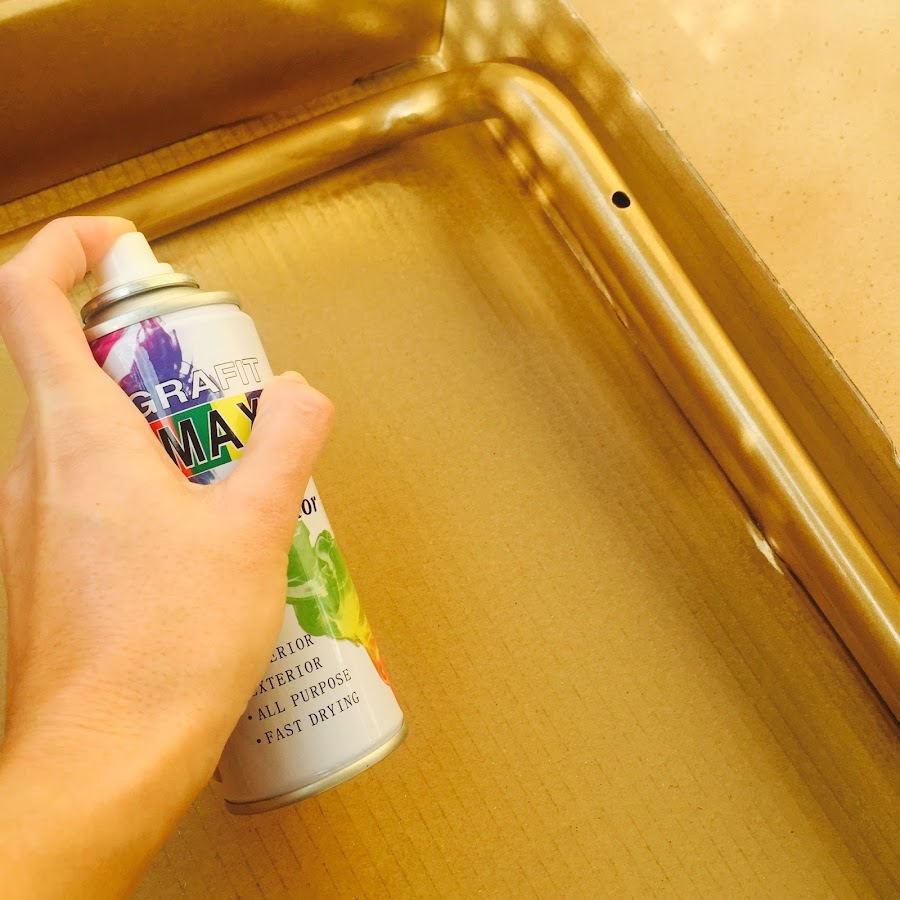 El primer paso es desplegar todas las piezas del carro sobre la caja de cartón en la que vienen y pintarlas con el spray dorado. Os aconsejo hacerlo en un lugar donde no haya problema de manchar, porque yo he dejado el suelo del balcón un poquito glam con el dorado... (pero monísimo, eso sí).