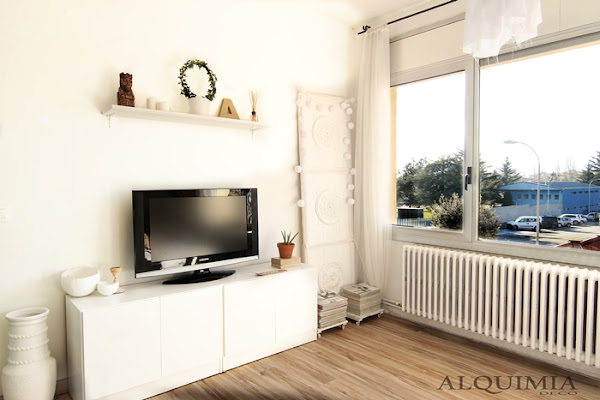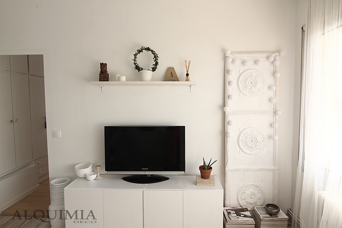 Como veis hemos tenido que quitar un trocito de mueble, que a decir verdad, me gusta mucho más así que no con los cajones en el medio, ¿Os acordáis como era?, así que en su lugar, hemos juntado los otros dos trozos y le hemos dado un lavado de cara a ese rincón. Todavía no está del todo terminado porque quiero añadirle algunas láminas o marcos al lado del televisor y alguna que otra cosita más pero de momento ya va encaminado.