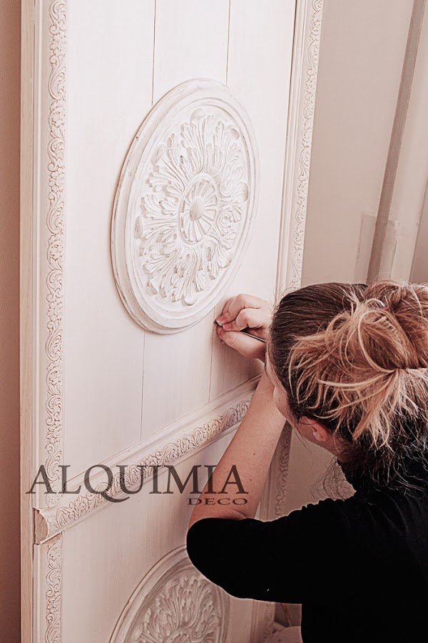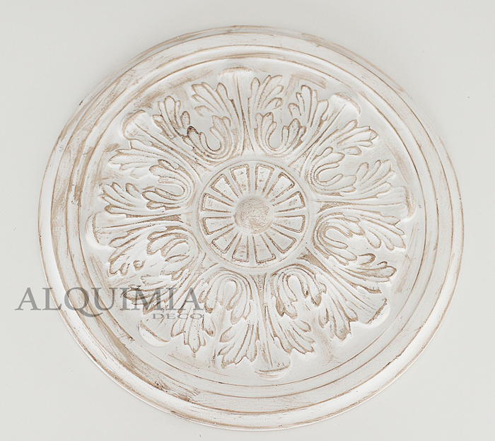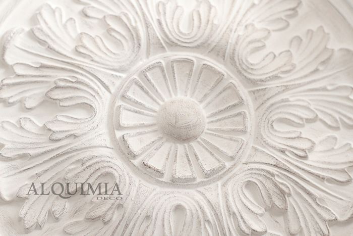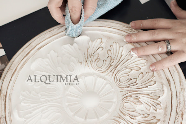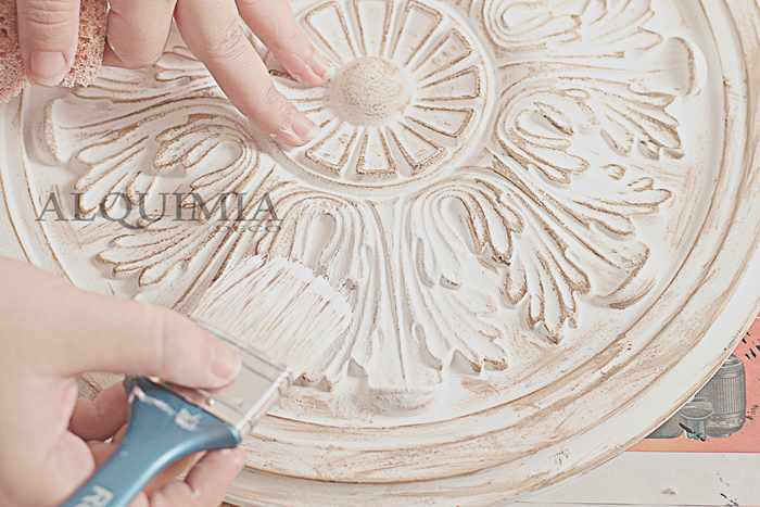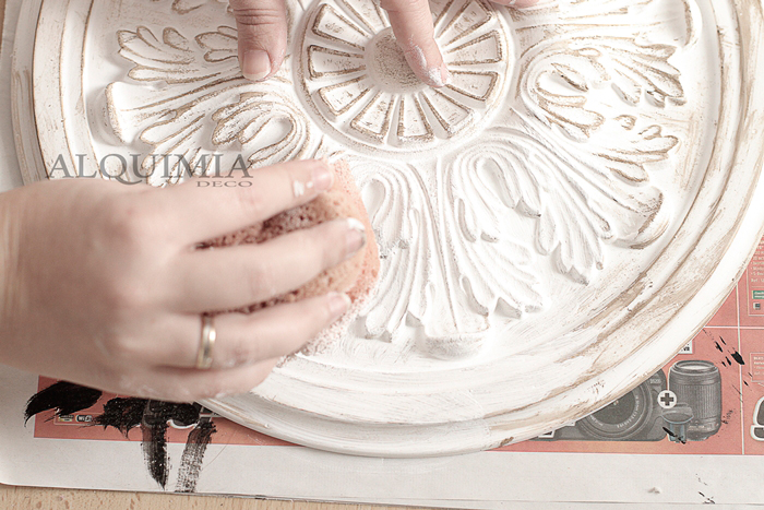 Una vez pintado, volvemos a coger el roseton y lo pintamos de blanco por encima del betún, no hay que echar mucha pintura, y acto seguido le pasamos un trapo o una esponja para quitar el exceso de pintura y que se vea un poco la veta.