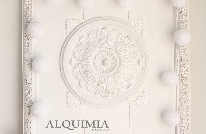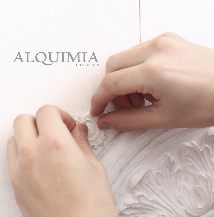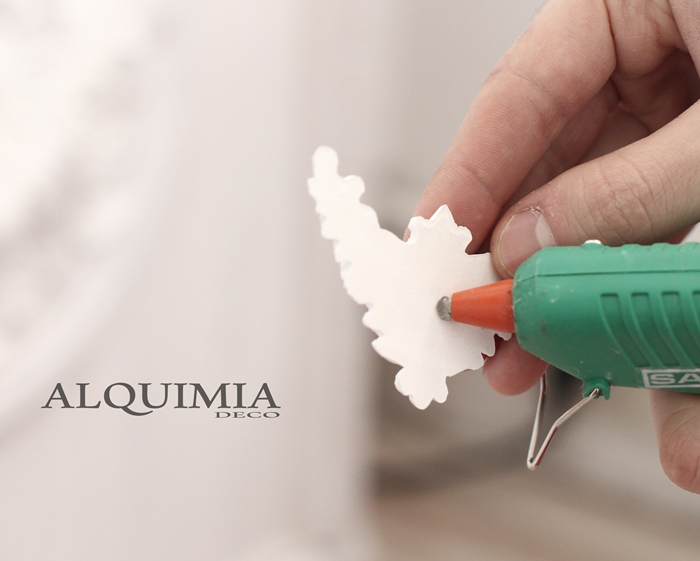 Lo dejamos secar y después enganchamos la moldura de dentro. Una vez seca nuestra cola, con un poco de cola caliente pegamos los rosetones a la altura deseada.