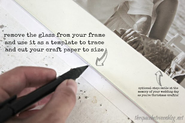 Sabiendo que esto sería solo una decoración temporal para estas fechas, utilizó cinta adhesiva de doble cara para pegar una cartulina de color crema en el lado frontal del cristal en un marco y así poder reutilizar su marco con la foto de su boda cuando acabe estas fiestas de Navidad.