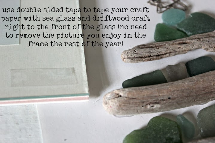 2.- Cogemos el marco de madera, los cristalitos de la playa de diferentes tamaños, los trocitos de tronco, la pistola de silicona y la cartulina y comenzamos a pegar todo como en la imagen, con forma de árbol.