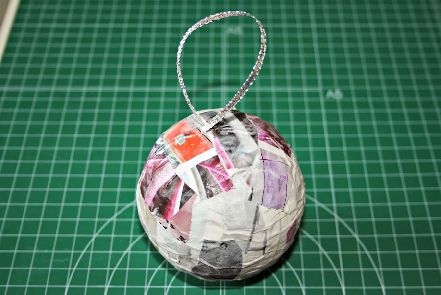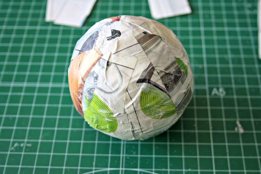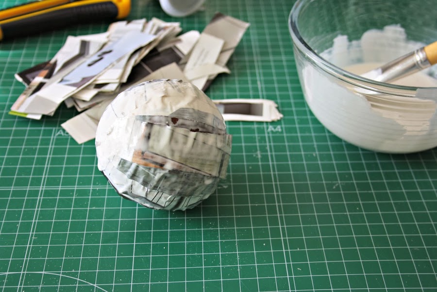 2. Cogemos las bolas de corcho (también pueden ser bolas de navidad que no uses porque estén pasadas de moda o simplemente ya no te gusten) y le ponemos cola y vamos pegando las tiras de papel una capa sobre otra, combinando tonalidades que nos gusten.