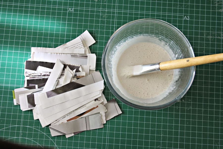 1. cortamos las hojas de revista en tiras de aproximadamente 2cm. y diluimos la cola con un poco de agua.