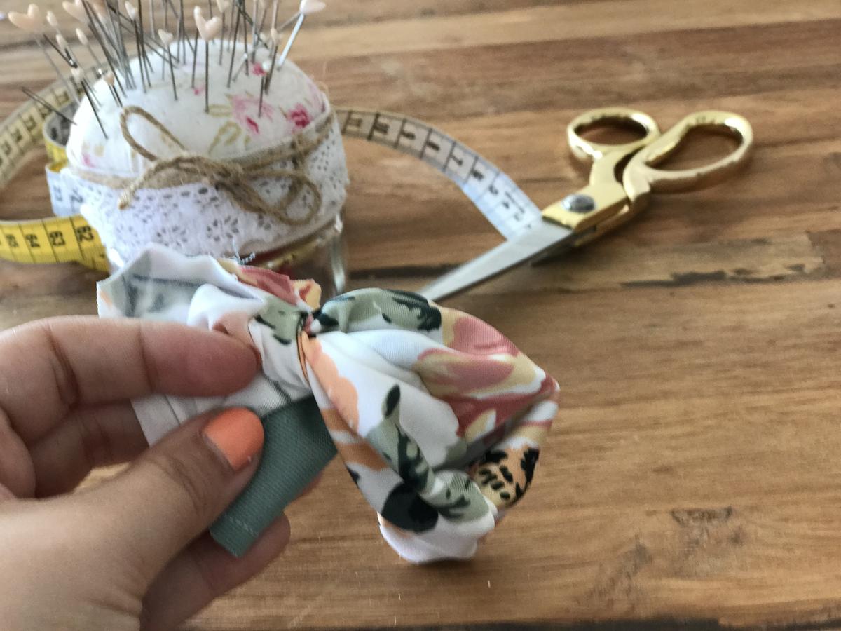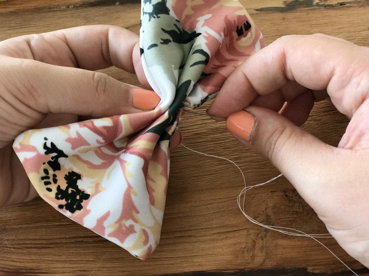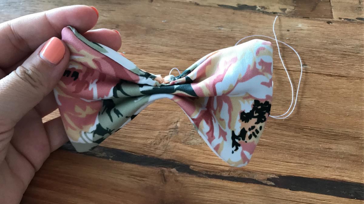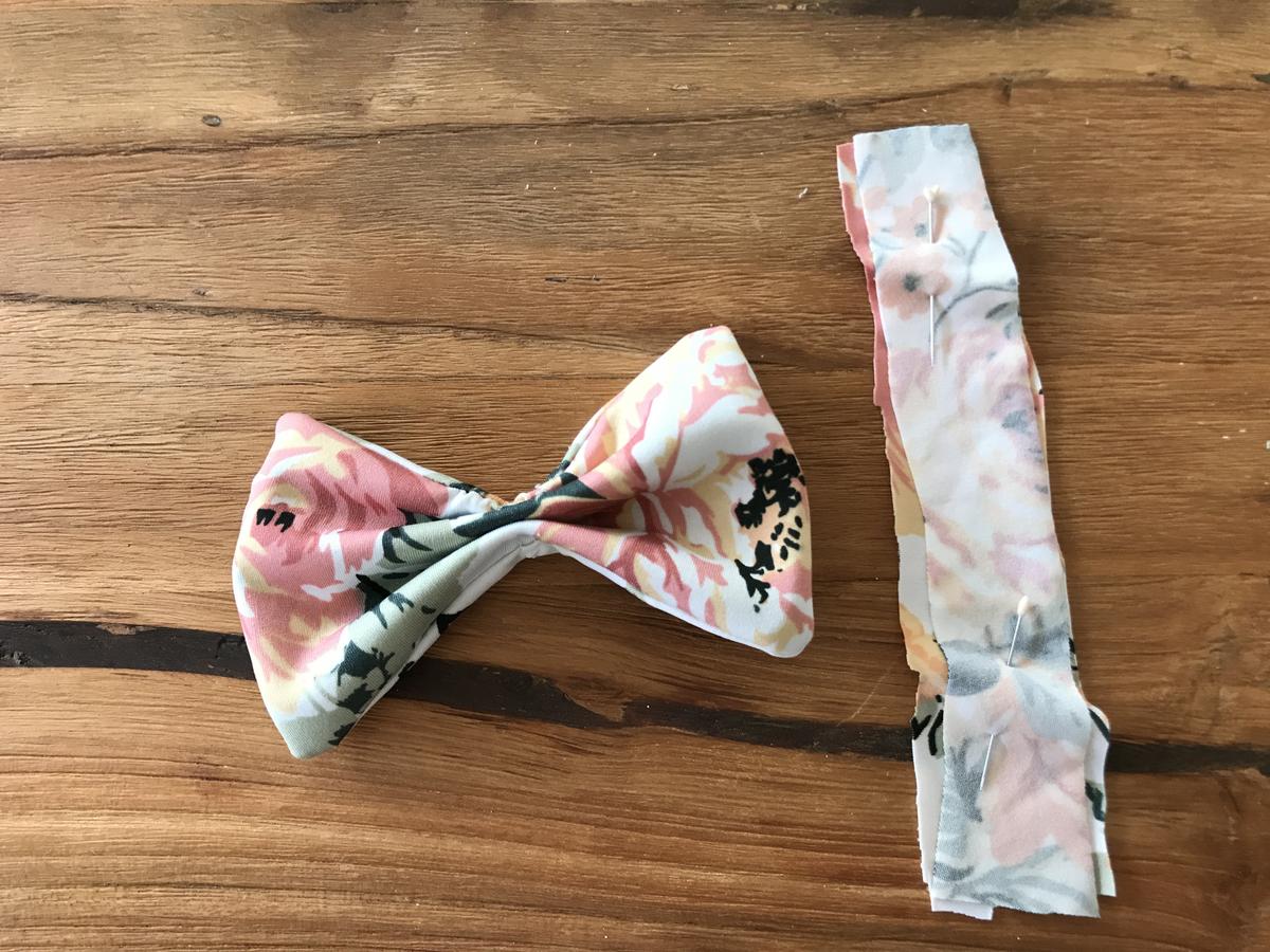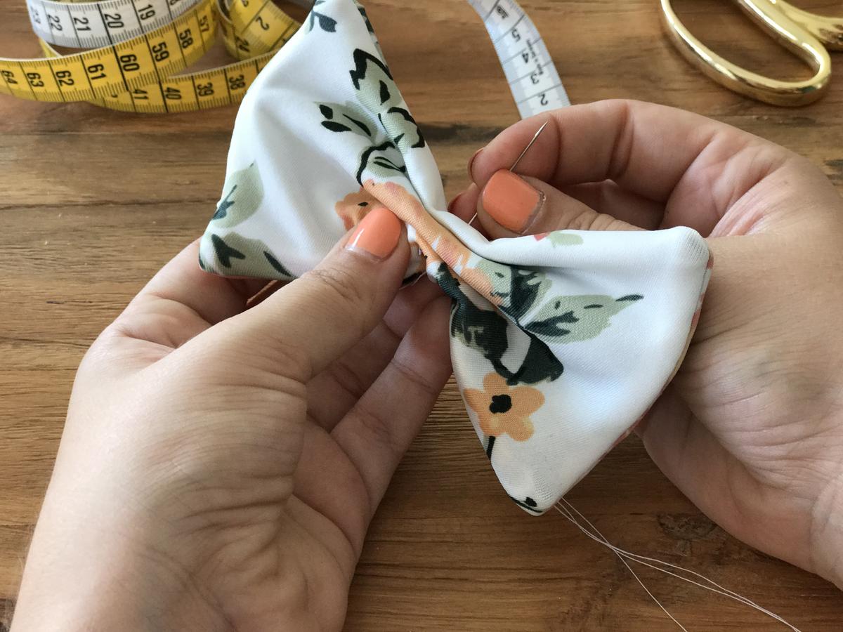 Ahora toca el turno de convertir este rectángulo en una pajarita, así que doblamos a modo de acordeón, como nosotras veamos y a nuestro gusto. Fijamos con unas agujas y damos unas puntadas para que quede bien atada y marcando la forma de pajarita.