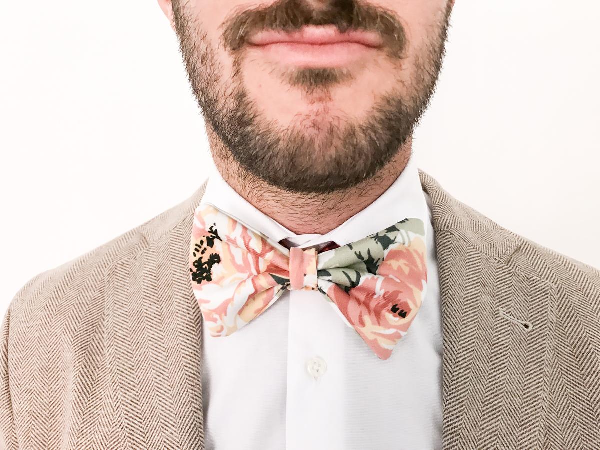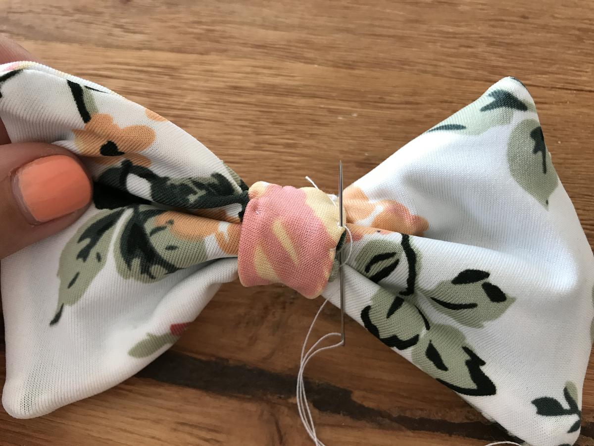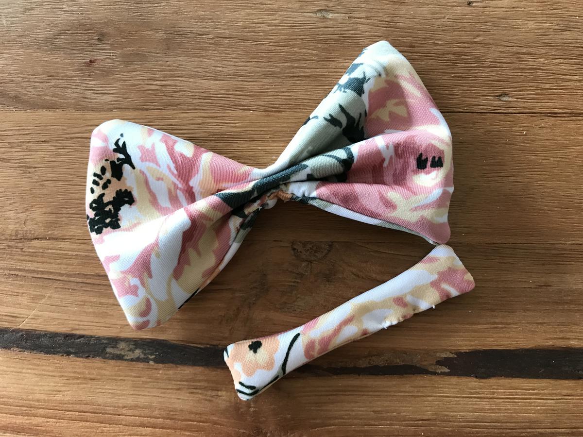 Pasamos la cinta alrededor de la base de la pajarita y pasamos unas puntadas para fijarla por la parte trasera. Y ahora sí que sí, ya tenemos lista nuestra pajarita personalizada!