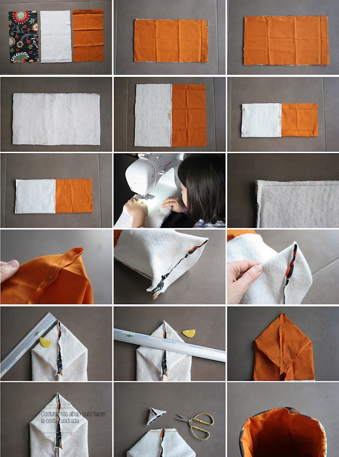El proceso es bien sencillo como podéis ver en las imágenes. Lo más difícil de ver puede ser los cortes finales... Sólo tenéis que tener en cuenta que esas últimas costuras, serán dos de los lados de la base de la cesta.
