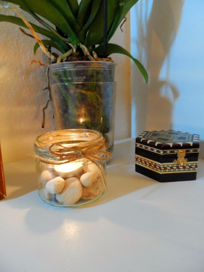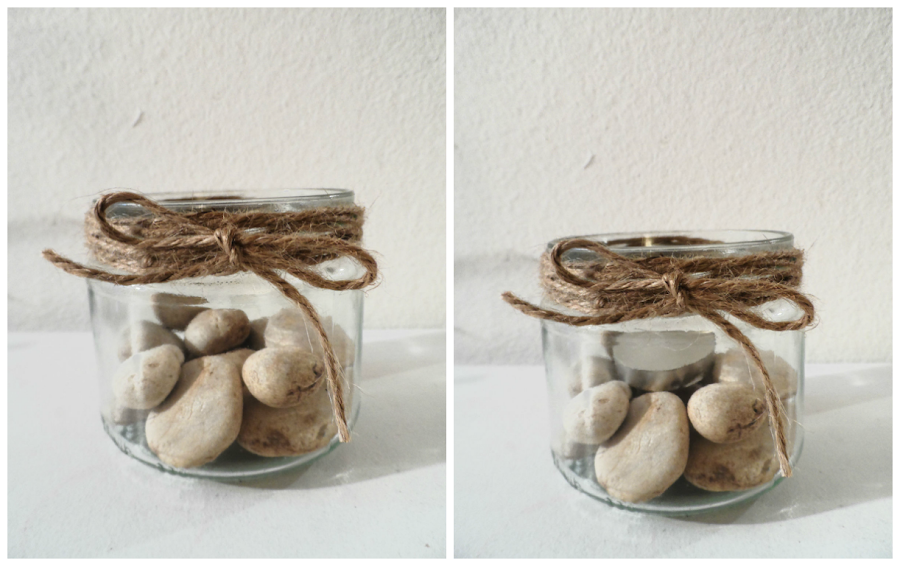 Luego llenaremos el tarro con las piedras y encima de ellas colocaremos la velita, y listo, ya tenemos nuestro portavelas.