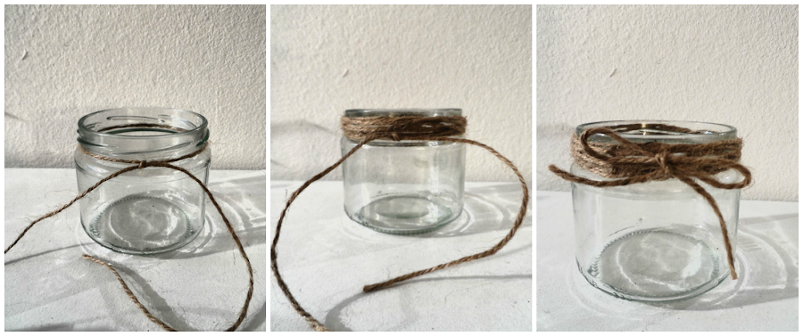 Comenzaremos atando con un nudo la cuerda de sisal alrededor de la boca del tarro de conservas, dejando libre un cabo bastante largo, con el otro cabo iremos dando vueltas a la apertura, hasta cubrir los bordes del tarro que sirven para enroscar la tapa. Una vez tapado, haremos un nudo con el cabo que hemos dejado suelto y a continuación haremos un lacito y cortaremos los cabos con la medida deseada.