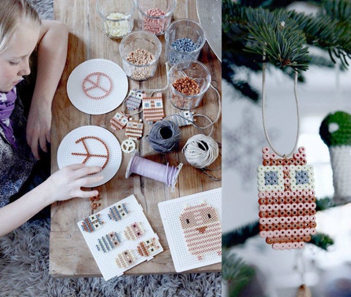 Seguro que esta manualidad a los peques les encanta. No sé en tu casa, pero en la mía mis hijos cuelgan en el abeto los adornos que han hecho en el cole, bolas de papel pintadas, postales......la Navidad es muy importante para los niños y no me importa que mi árbol no tenga tanto estilo como a mí me gustaría.La segunda propuesta con Hama beads se trata precisamente de realizar adornos para el árbol de Navidad, copos de nieve, búhos, estrellas.....Seguro que es un buen plan para pasar en familia una tarde lluviosa (como la de hoy) creándolos con la ayuda de tus hijos. ¡Ellos son unos expertos en crear figuras con ese juego!