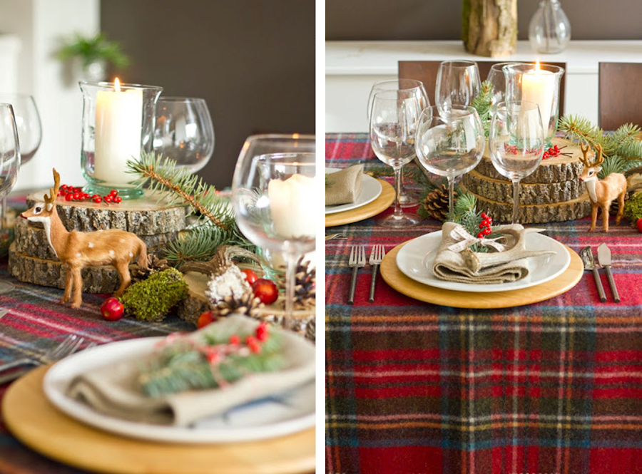 Aunque este última idea para adornar tu casa con renos estas Navidades no es una manualidad, no me he resistido a mostrártela. Se trata de una mesa decorada con renos en miniatura, un mantel de tartán, troncos cortados, acebo y ramas de abeto.