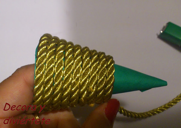 2- Empezar por la parte mas ancha del cono a pegar la cuerda .
