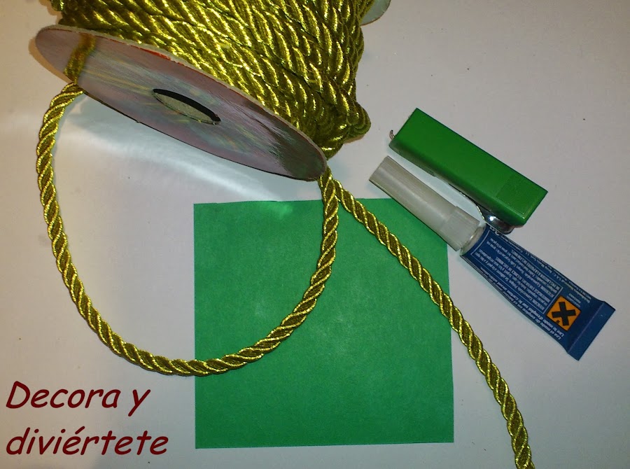 Tenéis que ir enrollándola por todo el alrededor de la cartulina , para pegarla le pondremos gotas de pegamento a medida que pasamos la cuerda.