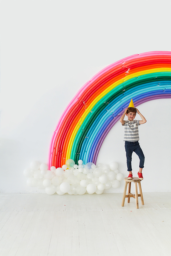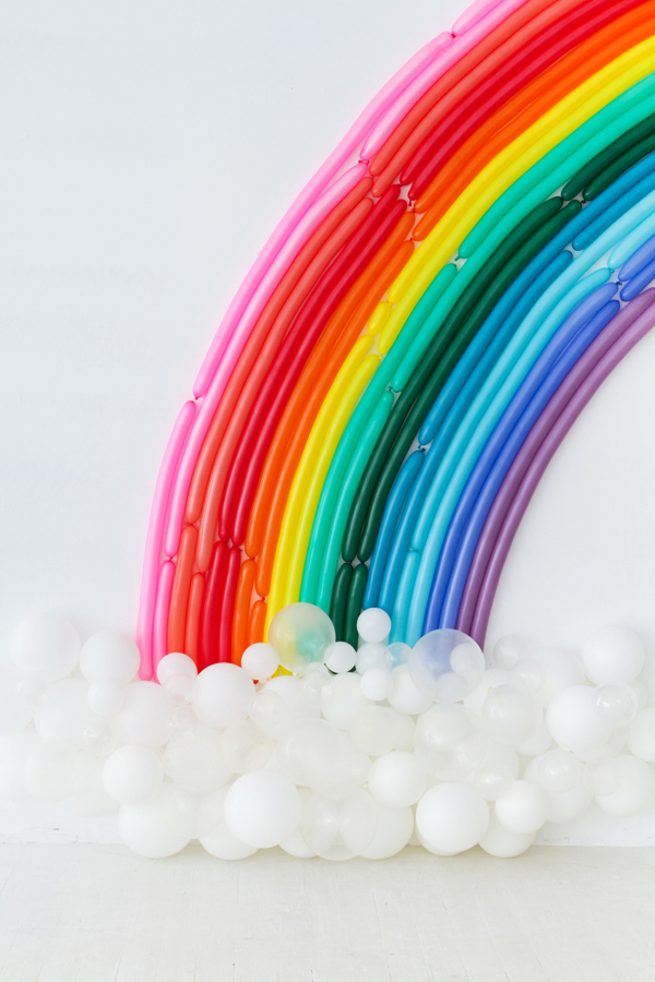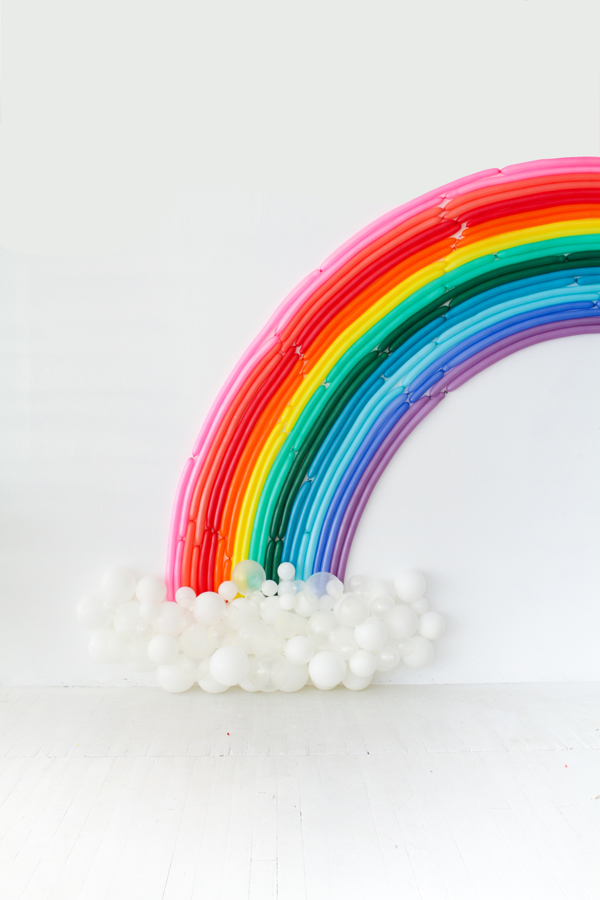 Paso 3: cuando hayáis terminado con el arco iris, lo rematamos con un manojo de los globos blancos en distintos tamaños, empezando con los más grandes, y rellenando los huecos con los globos más pequeños ¡Ya lo tenemos!