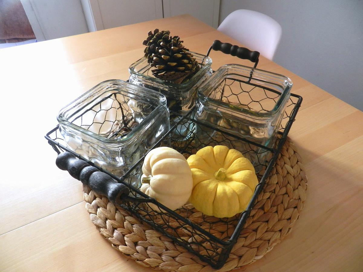 Las de puntas doradas no se ven tan bien en la foto pero al natural queda muy chulo. Cómo podéis ver también he usado las calabazas pequeñas que pinté en Halloween (podéis verlas aquí) para decorar y con una guirnalda dorada en el último bote podemos acabar de rematar nuestro centro de mesa.