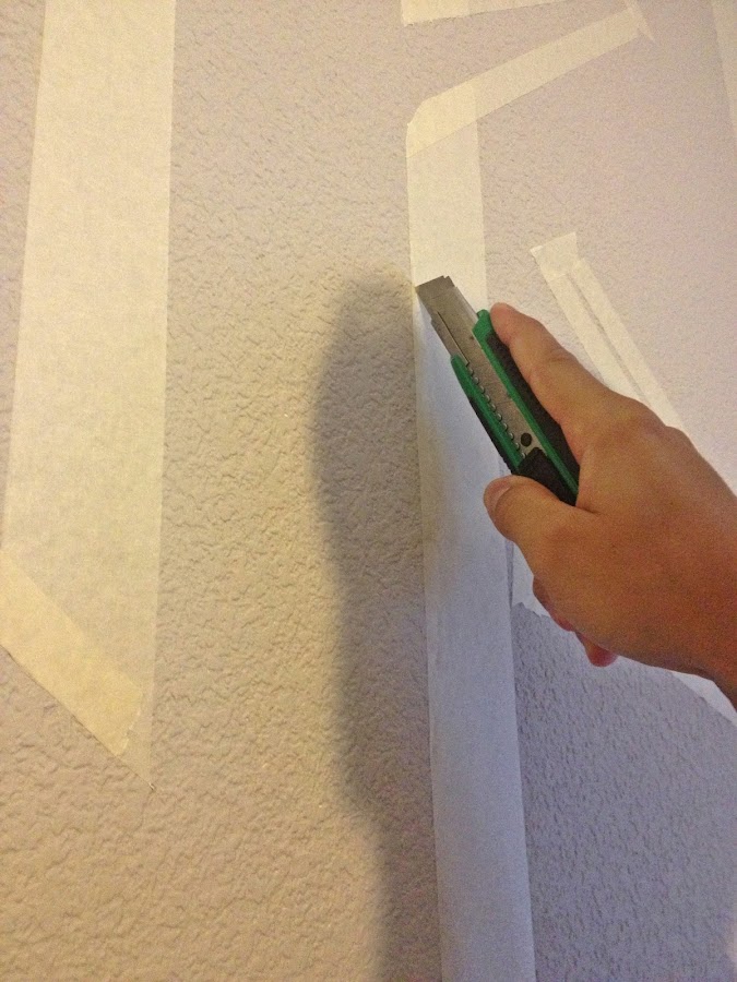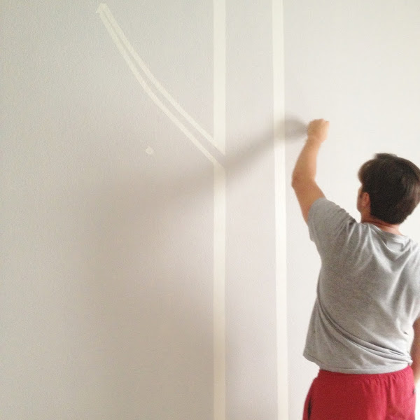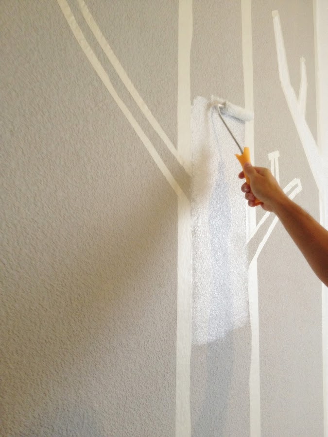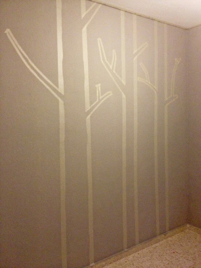 1. En primer, con la habitación ya pintada (en este caso en color gris), vamos marcando con cinta de carrocero lo que serán nuestros troncos y, por supuesto las ramas, nos os preocupéis porque es más fácil de lo que parece!